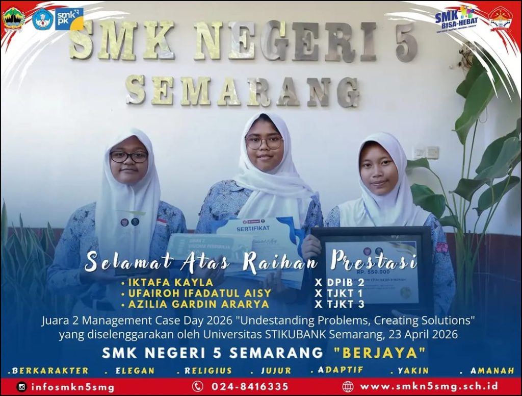 Semarang — Prestasi membanggakan kembali ditorehkan oleh siswa SMK Negeri 5 Semarang dalam ajang bergengsi Management Case Day 2026 bertema “Understanding Problems, Creating Solutions” yang diselenggarakan oleh Universitas Stikubank pada 23 April 2026. Dalam kompetisi yang diikuti oleh berbagai sekolah dan peserta dari beragam latar belakang, tim perwakilan SMKN 5 Semarang berhasil meraih Juara […]